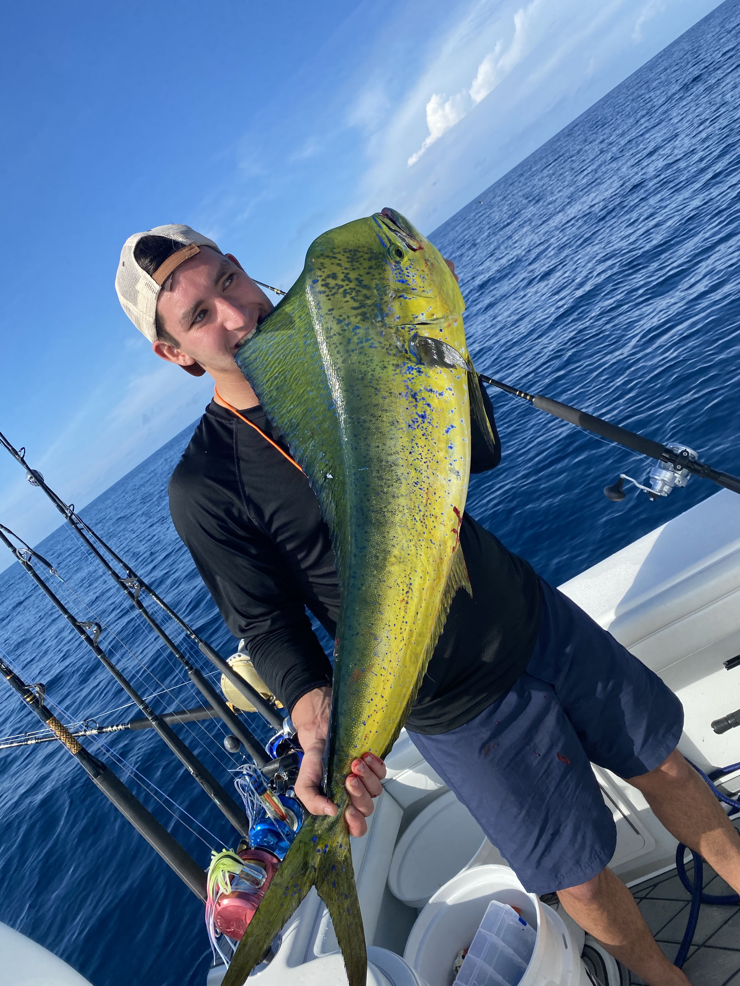 Again, we immediately threw out our trolling lures and within seconds we hooked up on a Wahoo and a Mahi! Doubled up action! That’s when it got crazy aboard our 36Ft Yellowfin, it was one hook up on to another! We ended up with 7-8 Mahi and a nice sized Wahoo within hours!